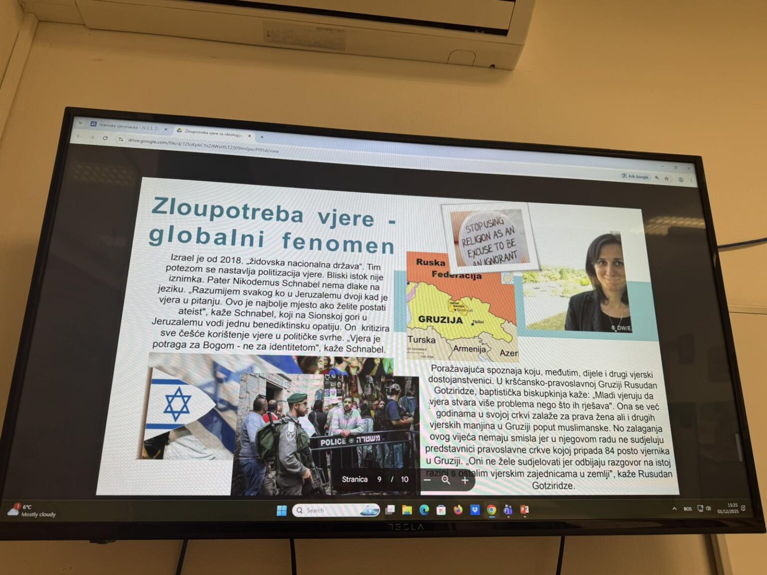 Kroz interaktivno izlaganje učenici su analizirali načine na koje se rodno zasnovano nasilje prikriva ili opravdava kroz pogrešna tumačenja religijskih učenja, te kako mediji mogu oblikovati percepciju nasilja – bilo normalizacijom, senzacionalizmom ili kritičkim pristupom. Profesorica je predstavila i ključne mehanizme borbe protiv štetnih narativa: pravilno religijsko obrazovanje, medijsku pismenost, razvijanje kritičkog mišljenja i prepoznavanje manipulativnih poruka.