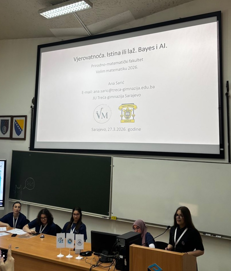 Posebno smo ponosni na učenice Merjem Đonko (I-1) i Anu Sarić (I-1), koje su pod mentorstvom profesora Edina Liđana predstavile svoja kratka, ali izuzetno zapažena izlaganja u sklopu tematske sesije „Matematika i AI“.