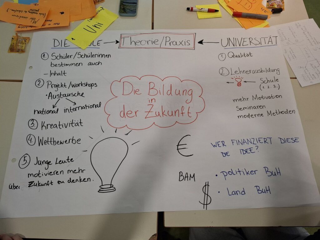 Radionice se odvijaju u nekoliko radnih faza. Prva, na kojoj su učestvovale naše učenice i učenici, realizirana je u Drugoj gimnaziji Sarajevo, završna radionica na kojoj će grupe učenika iz svih škola učesnica projekta nakon svojih školskih radionica objediniti sve ideje, planirana je za mart naredne godine i za domaćina ove faze projekta odabrana je naša škola. Završna manifestacija sa prezentacijom objedinjenih zajedničkih rezultata i ideja bit će realizirana u inspirativnom okruženju Europa Hausa, a domaćin i pokrovitelj ove završne manifestacije bit će g. Schmidt, visoki predstavnik u Bosni i Hercegovini, uz podršku Njemačke ambasade u BiH i Centrale za školstvo u inostranstvu Savezne Republike Njemačke (ZfA).